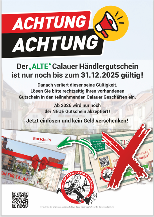 Bis zum Jahreswechsel möchten alle Mitglieder ihre Kunden verstärkt darauf hinweisen, dass der alte Händlergutschein ausläuft und nur noch bis zum Jahresende einlösbar ist. Der neue Gutschein mit der roten Schleife ist bereits seit 3 Jahren im Umlauf. Zukünftig sollen die Gutscheinpartner und der Händlergutschein noch stärker vermarktet werden. Der Gutschein wird von Calauern und Gästen gern verschenkt und stärkt damit aktiv die Innenstadt.